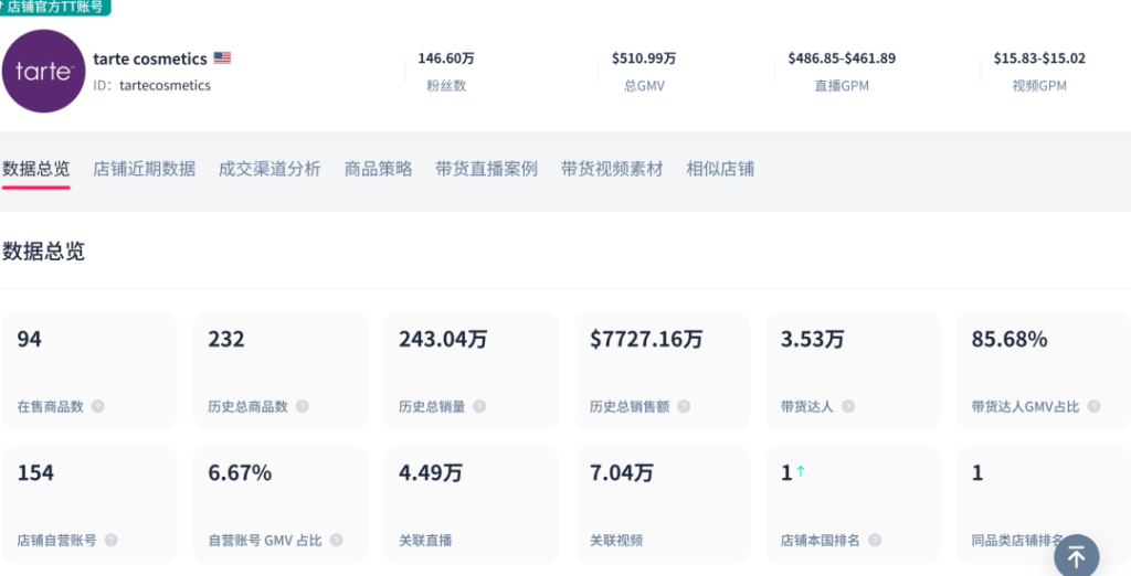 而在黑五大促期间,美妆个护类目小店Tarte Cosmetics表现尤为亮眼,以1219万美元的GMV高居TikTok黑五大促小店榜榜首。