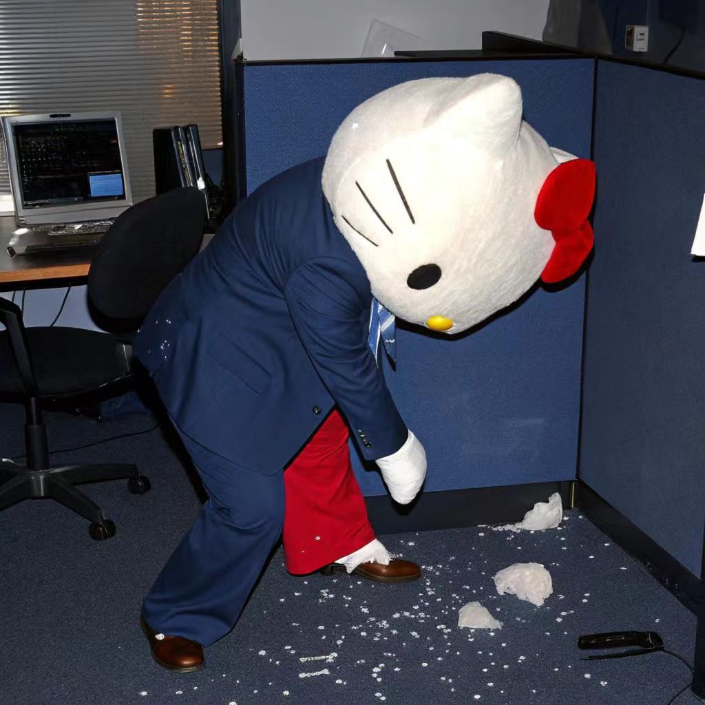 这不像极了打工人,喜怒哀乐都藏起来,只是面无表情地当一个打字机器吗?一时间,所有打工人都换上了 Hello Kitty 的头像。
