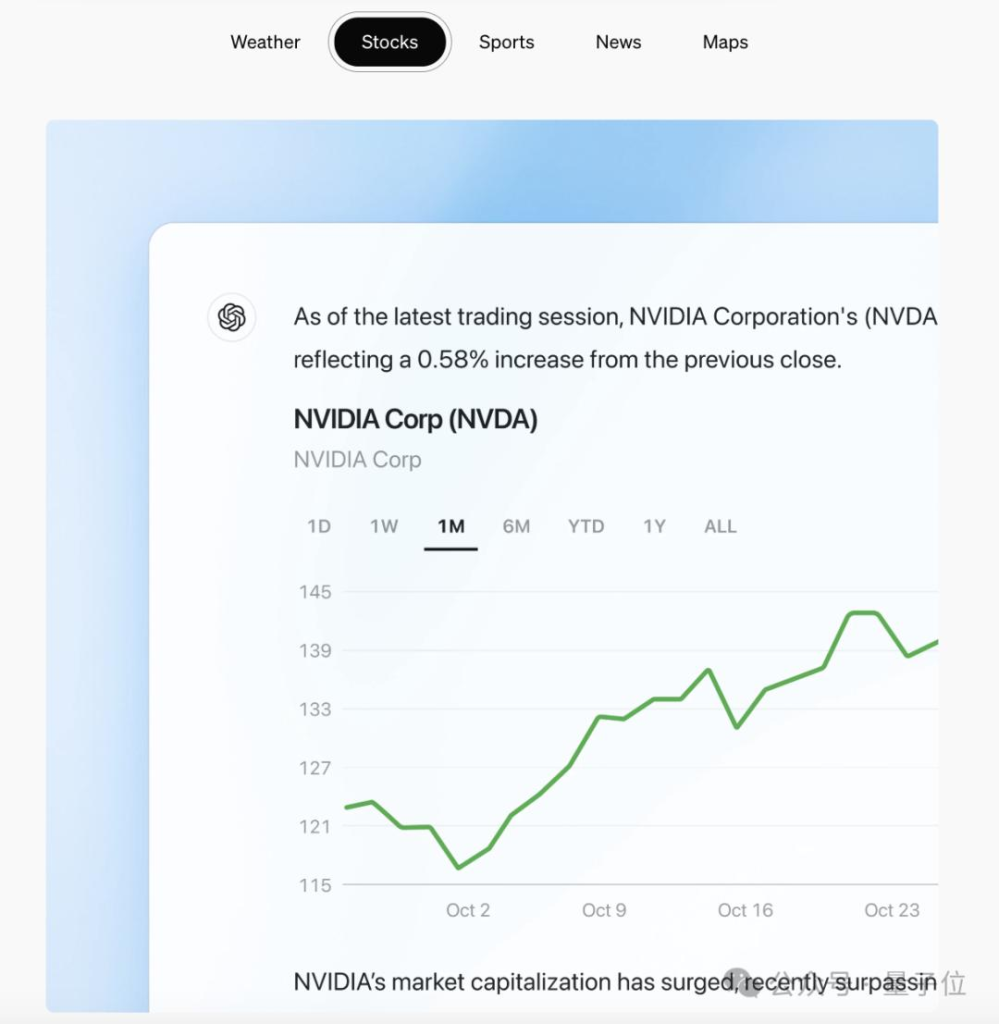 根据一个多月来的用户反馈,OpenAI也与新闻和数据提供商合作,在搜索功能中,为天气、股市、体育、新闻和地图等添加了最新信息和新的视觉设计——多模态结果