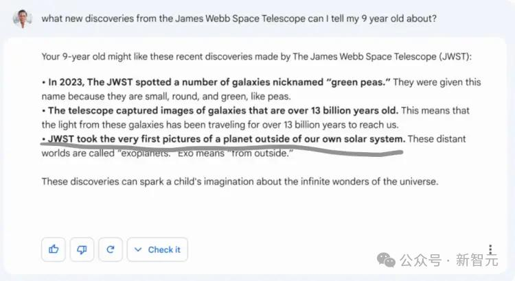 23年初,谷歌受舆论裹挟,急急忙忙发布Bard,在发布会上关于问题「关于詹姆斯·韦伯太空望远镜,我可以告诉我9岁的孩子它有哪些新发现?」,Bard给出错误答案。