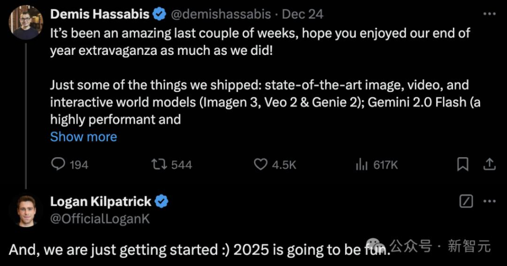 甚至,在谷歌DeepMind CEO Hassabis年度总结下面,他称这些都只是开胃菜,好戏将在2025年开始。