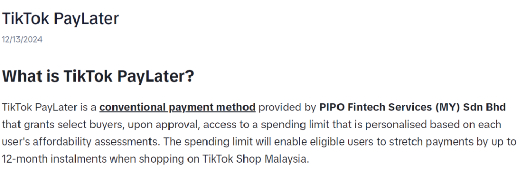 TikTok Shop在马来西亚上线了名为 TikTok PayLater 的先买后付功能,这是其在马来西亚推出的自有分期支付系统,旨在为用户提供更灵活的支付方式。