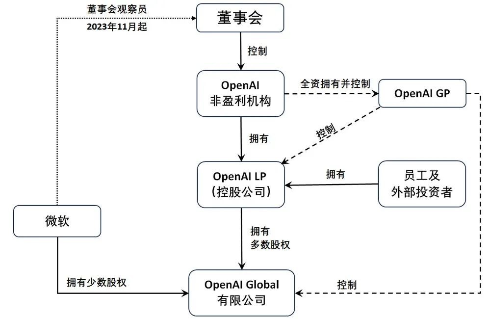 在原有的OpenAI非盈利机构之下,增设了盈利性的OpenAI LP控股公司,由非盈利机构、员工及外部投资者共同拥有。实际业务由OpenAI LP拥有多数股权的OpenAI Global有限公司经营。