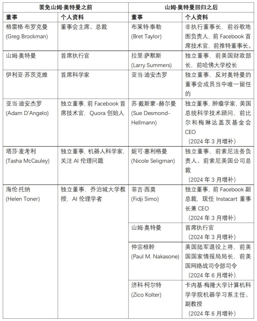 附带说一句,在挫败宫廷政变之后,奥特曼彻底改组了OpenAI董事会,原来投票同意罢免他的四位董事只有一人留任(亚当·迪安杰罗)。新的董事会几乎完全由独立董事构成,并于2024年3月、6月进行了两次增补,奥特曼就是通过增补重返董事会的。新的董事会成员都是在科学、政治或财经领域具备相当知名度的人,但是外界并不知道其遴选标准,其提名和当选流程也完全不公开。我们甚至不知道究竟存不存在正式的“董事会选举”流程!
