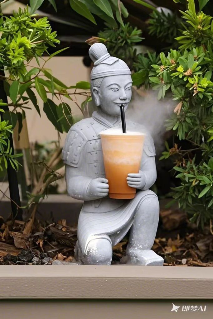 比如用时下流行的文物动作改造进行尝试。选取一张兵马俑的照片,点击使用“智能参考”功能,输入简单的promt:兵马俑喝奶茶,仅几秒钟,原图就生成为一张左手握奶茶的兵马俑图片,且可以看到,图片的其余部位都基本保持了原图状态,没有变形,全程也不需要额外再做涂抹描边等步骤。