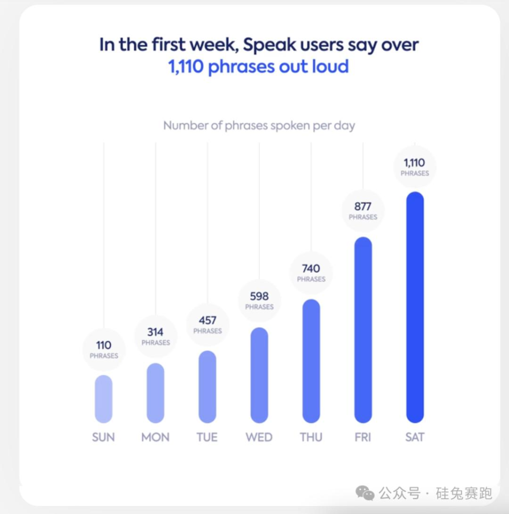 自上线以来,Speak的表现十分亮眼:应用下载量已经突破1000万次,光是今年,用户就已经累积完成了超2500万节个性化课程,同时用户在平台上开口说出的外语句子总数已超过10亿句;在第一市场韩国,Speak已经帮助6%的韩国人口通过Speak实现了英语流利;在企业端,有200多家企业选择Speak作为员工语言培训工具,员工使用率高达85%。