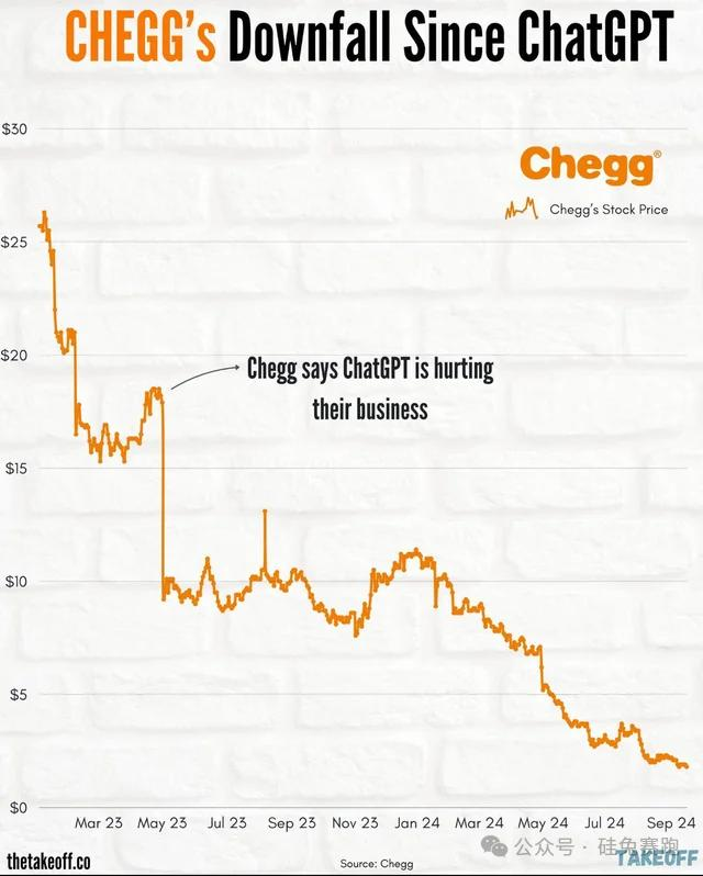 与此同时,AI的出现对于Chegg这样的传统在线教育平台,则带来了前所未有的冲击。作为曾经的在线教育巨头,Chegg主要提供考试准备和作业辅导服务,然而,2023年ChatGPT的出现给Chegg带来了致命威胁,比如ChatGPT能够快速生成作业解答和学习建议,直接替代了Chegg的核心服务,这让用户不再愿意为Chegg的订阅模式买单,导致其用户流失严重,Chegg订阅收入在2023年第一季度同比下降7%,第二季度总收入进一步下滑至1.828亿美元。