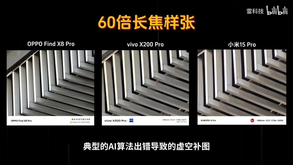 但AI不是万能的,它也会出错。雷科技之前曾对四台影像旗舰专门做过长焦方面的评测,当手机的放大倍数来到60倍后,几台手机的画质表现确实不错,但无一例外都出现了“虚空补图”的情况,多少有些画蛇添足。