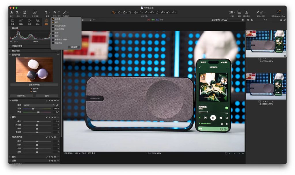 但从23年开始,Capture One就加入了各种AI功能,早期还只是加入一些自动白平衡、自动曝光度等手机上早有的简单功能,但随着大模型的成熟,它逐渐加入了自动「去灰尘」、「梯形矫正」、「调节高动态范围」等功能,虽说依旧算不上是高技术功能,但确实帮助小雷省了不少时间。