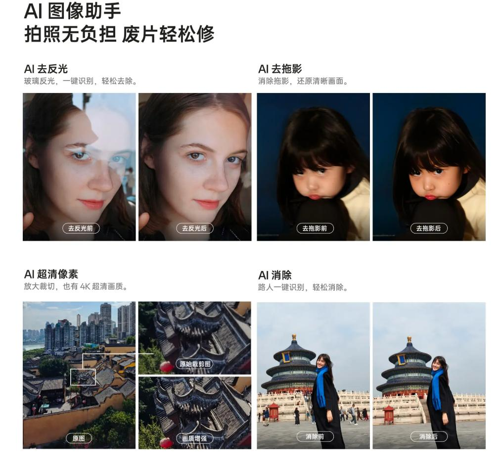 如今,手机上的AI影像进步飞快,其算法已自然到普通用户难以察觉的程度,而且还带来了一系列AI后期功能,例如AI消除杂物、AI消除人群、AI去反光、AI重新构图、AI风格化学习等,大大提升了用户出片率和后期速度。