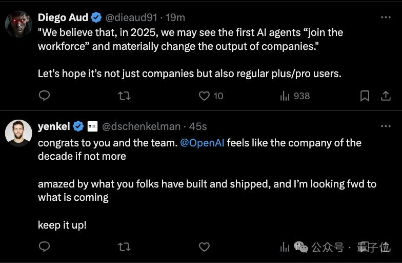 也有对新一年的展望:2025年,第一批AI Agent将加入劳动力大军;而将时间维度拉长,他们的目标已经转向真正意义的超级智能。