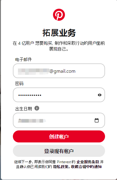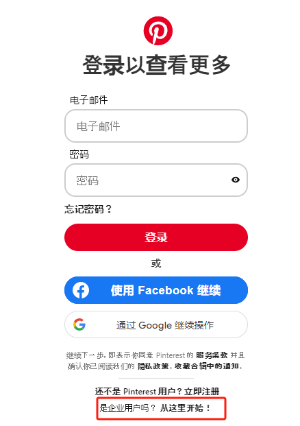如需创建新的企业帐户,注册时使用的电子邮件地址之前不得用于现有的 Pinterest 帐户。