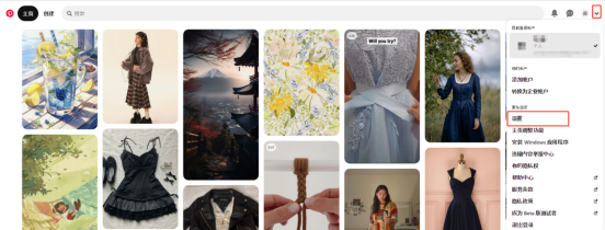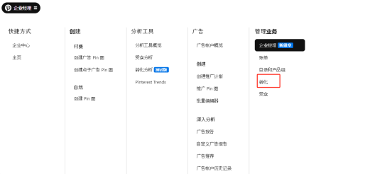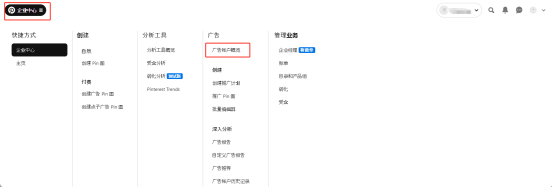① 登录 Pinterest 企业帐户 ② 点击页面左上角的 汉堡图标