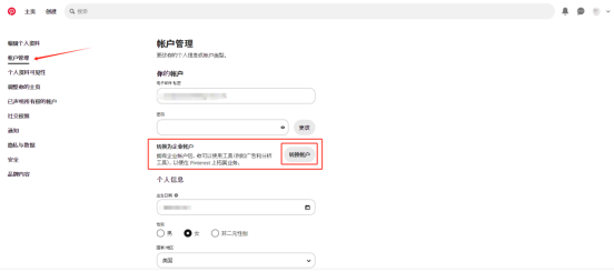 ② 如果你的个人帐户与其他 Pinterest 帐户关联,则需要取消关联帐户才能将其转换为企业帐户。