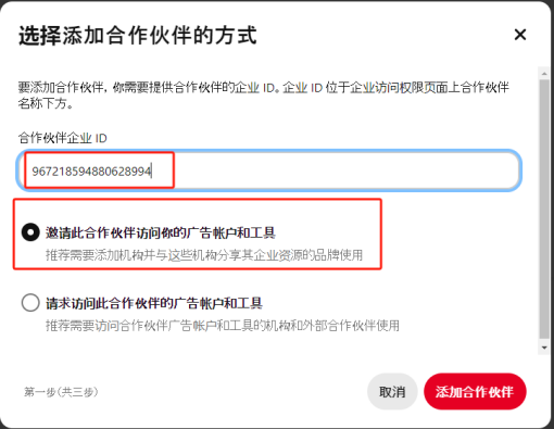 ② 分别输入邀请伙伴的ID,并点击【添加合作伙伴】