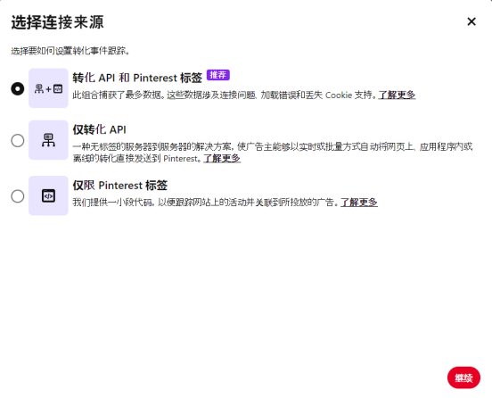 除 Pinterest 标签外,你还可以选择 使用 Pinterest 转化 API ,以最大限度地提高转化的可见性。