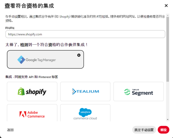 温馨提示:如果你已声明域名所有权且符合使用集成合作伙伴的条件,则安装 Pinterest 标签下方会列出这些合作伙伴。点击某个合作伙伴即可查看说明。如若不然,请继续按照以下步骤操作。