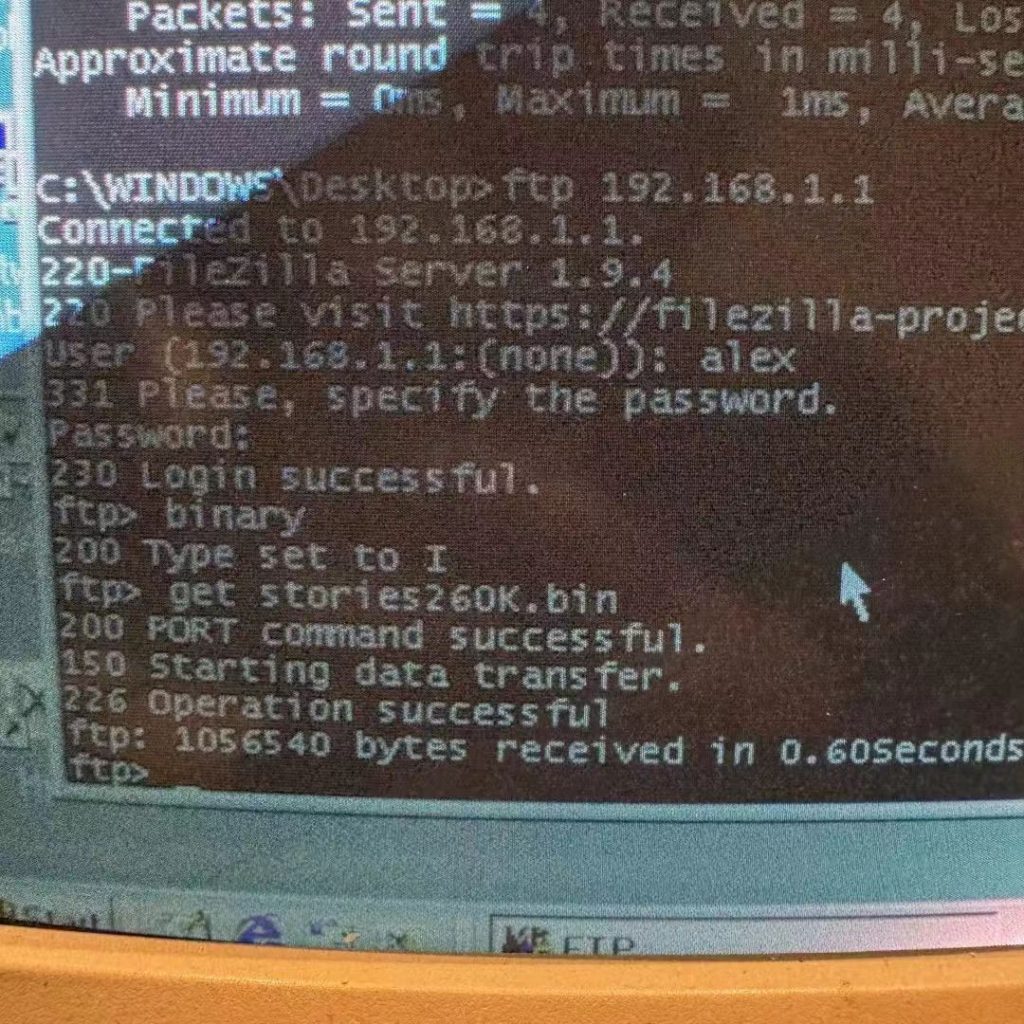 事实证明,FTP 在这些年里始终保持了向后兼容性。EXO 团队通过在一台 M4 MacBook Pro 上运行 FileZilla FTP 服务器,通过 USB-C 转以太网适配器的方式将其连接到 Windows 98 机器,设置静态 IP 后,可以直接通过命令行传输文件。
