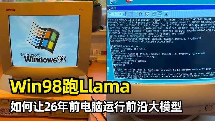 260K 参数的 Llama 模型在 Windows 98 上运行,生成了一个关于 Sleepy Joe 的故事