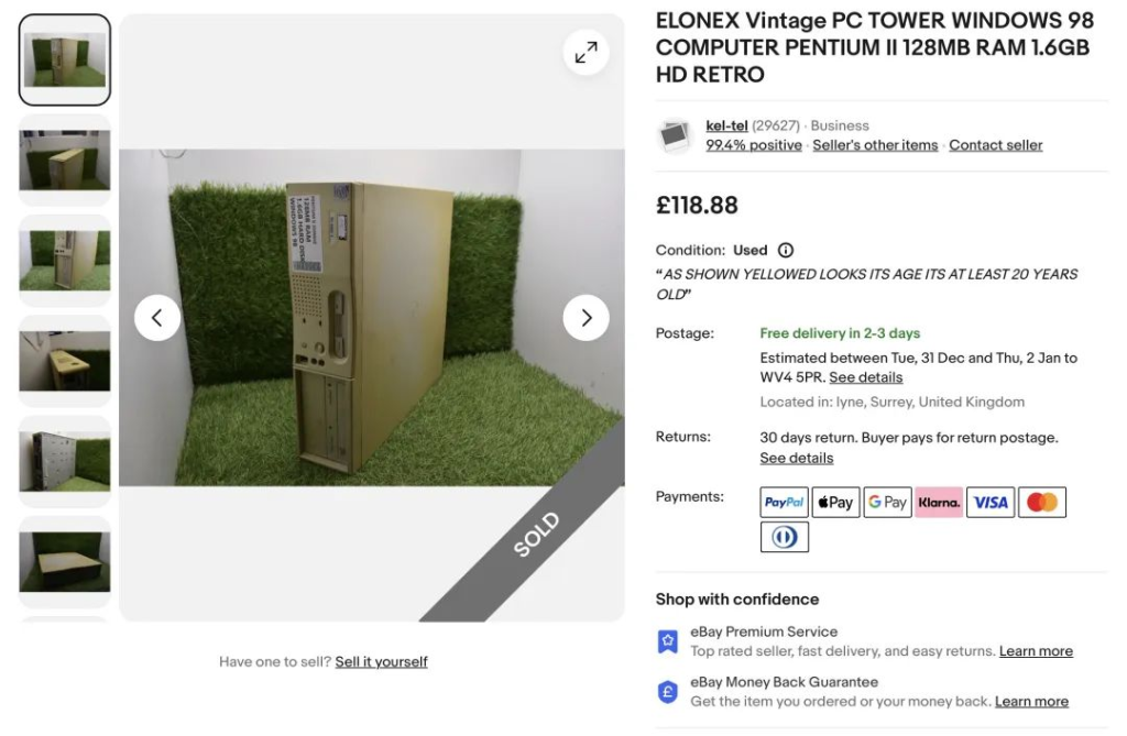 首先在硬件方面,EXO 在 eBay 上花费了 118.88 英镑(约 1087 元)购买了一台 Windows 98 Pentium II PC 作为实验基础设备,其配备 128MB RAM,正如下图所示: