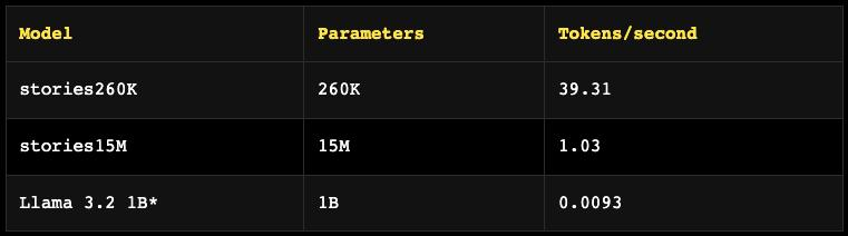 根据上述结果显示,当升级到 15M 参数量的 LLM 后,生成速度降到了略高于 每秒 1 token。然而,当尝试运行 Llama 3.2 的 1B 参数量模型时,速度则降到了极其缓慢的每秒 0.0093 token。