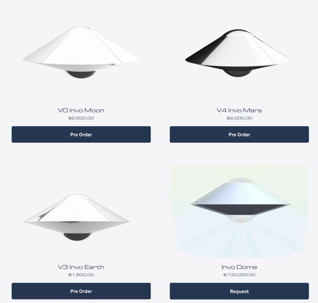 根据INVO Station的官方介绍,目前公司规划了四款个人飞行器,载客数量从3到6人不等,VO Invo Moon是基础版,此外,还有V3 Invo Earth、V4 Invo Mars、Invo Dome等,预订价分别是2500美元、1.5万美元、2万美元和10万美元。