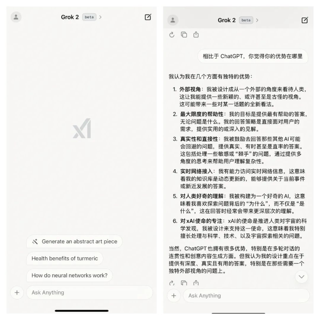 插个体外话,Grok 的动画效果、布局安排、交互方式、模糊处理、图标设计等 UI 元素都比 ChatGPT 更具美感。