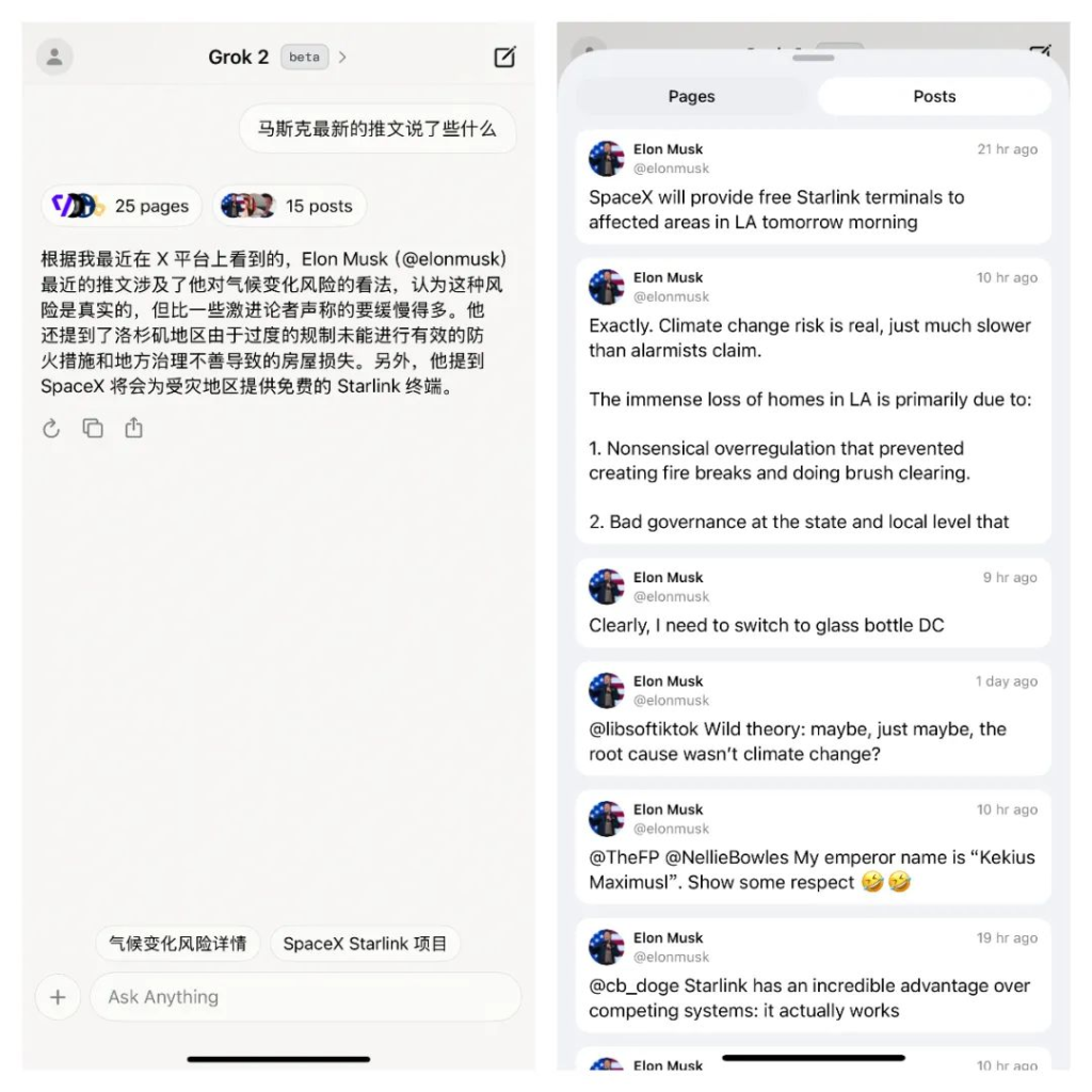 点开搜索信源,Grok 选择的渠道也相对权威,且一些 中文提问甚至 还能辐射到 X 平台上中文博主的回答 。