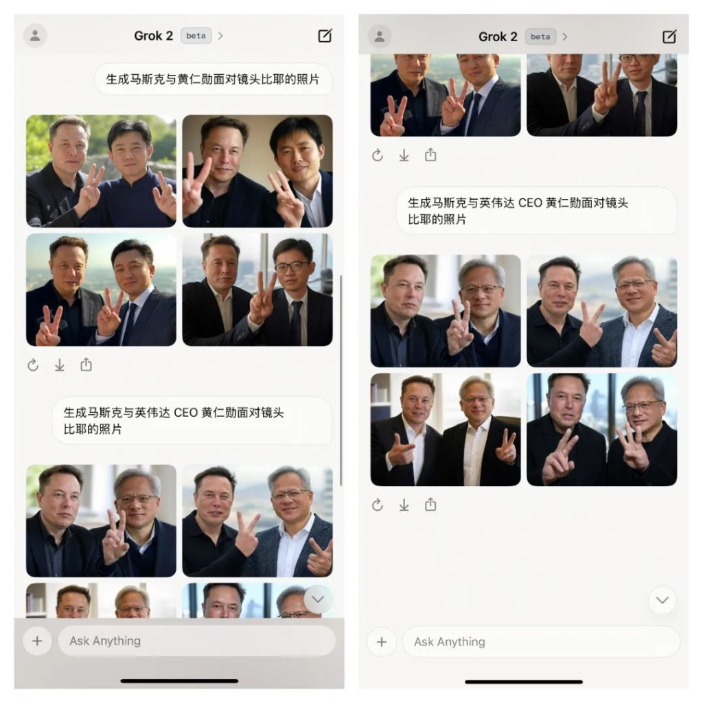 在国内外 AI 助手都对公众 人物有所顾忌的的情况下,Grok 能够生成堪比「照片级真实感渲染」的人像。