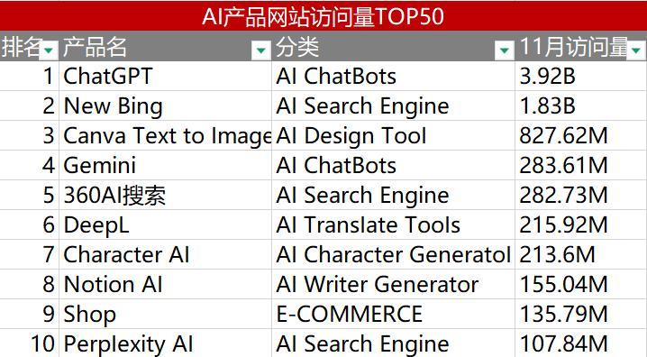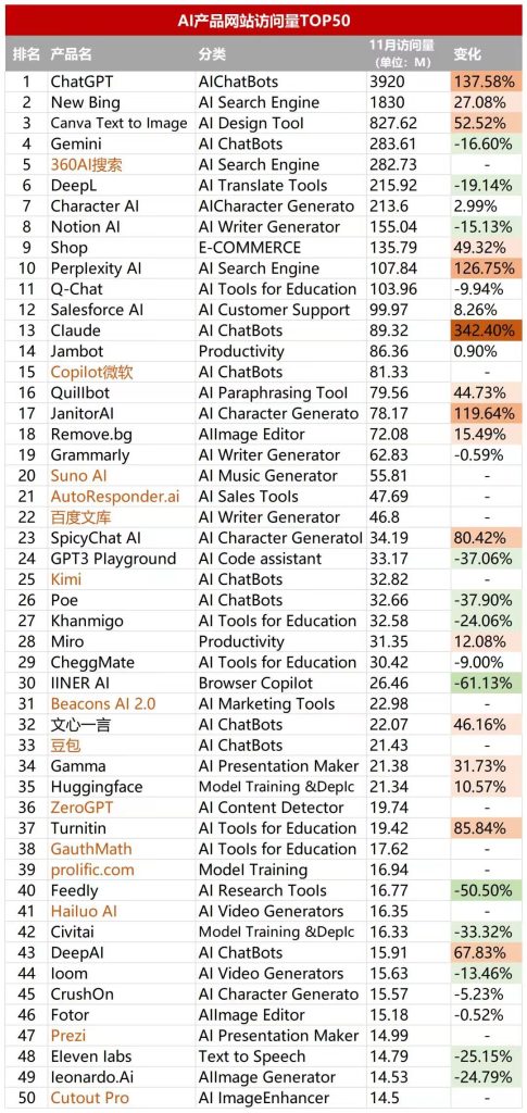 对比2024年1月和11月AI产品流量TOP50,整体没有发生太多变化。