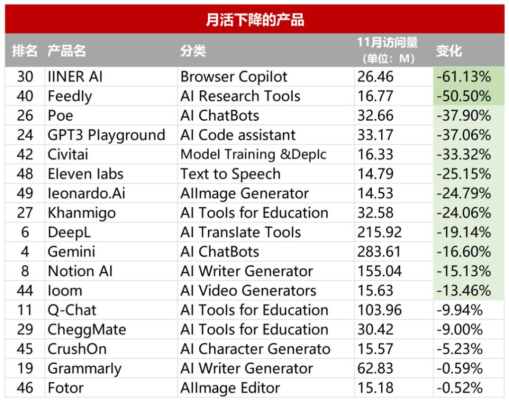 截至到11月,对比年初榜单,总共有17个产品的流量出现下滑,其中下降幅度最大的前三分别是AI协作空间IINER AI、AI阅读器Feedly和AI聊天机器人Poe,分别下降61%、51%、38%。