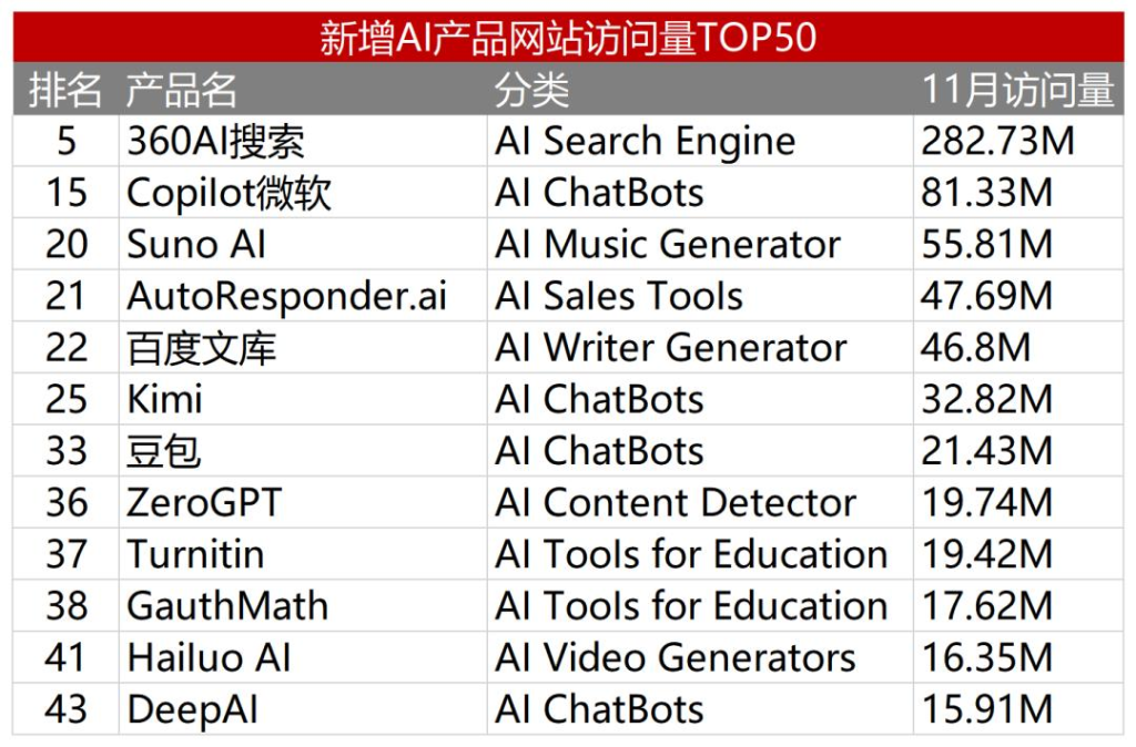 除了前面提到的月活翻倍的产品ChatGPT和Claude,其他月活上升的AI ChatBots还有文心一言和DeepAI,分别上涨46%和68%。新增产品有Copilot、Kimi和豆包,分别在11月榜单中占据15名、25名和33名。