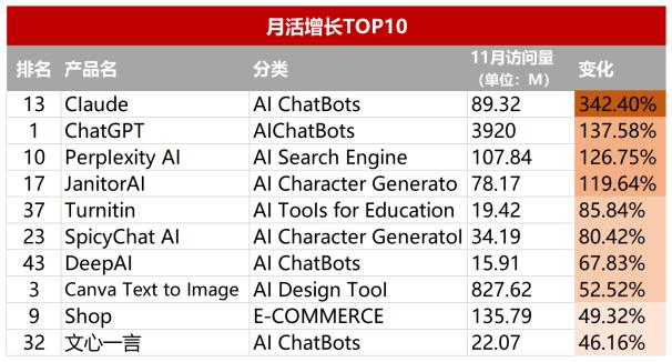 从1月到11月,在流量增长最快的前10个产品里,有4个产品的访问量增长了一倍,分别是ChatGPT、Perplexity、AI伴侣产品Janitor AI以及Claude。