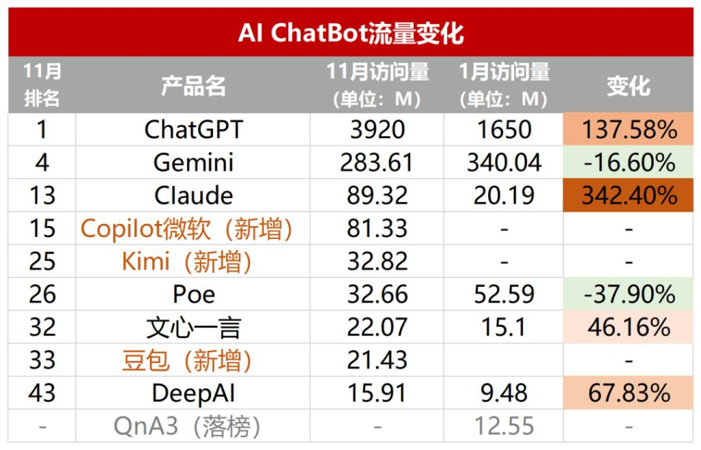 尽管在很多人看来,AI应用的爆发速度低于预期,但当我们观察1-11月AI应用的流量变化,仍然发现了一些有意思的变化: