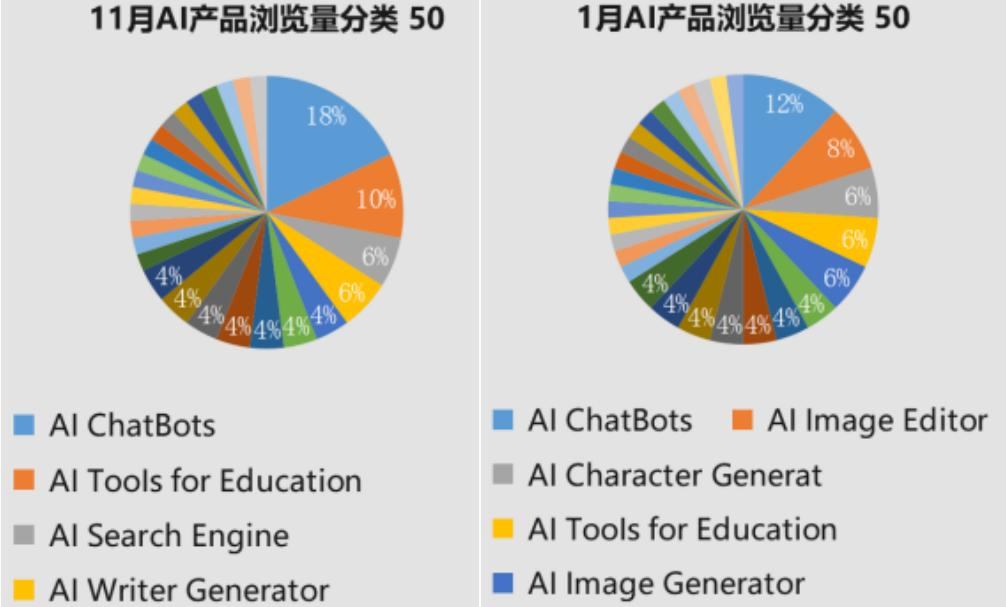 4)AI应用在部分细分领域也开始崭露头角,其中AI教育是最大亮点。对比去年1月和11月Top50,AI教育产品从3个增长到5个。此外,AI搜索、AI伴侣、AI视觉设计、AI电商的产品也均有不错表现。