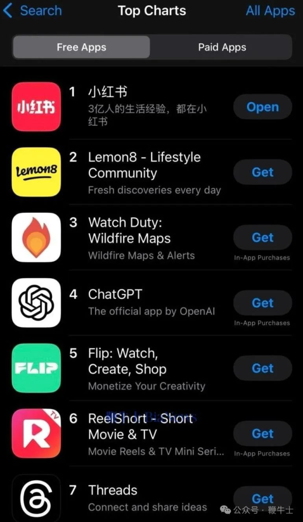 很快,小红书成了苹果美榜第一,由 TikTok 提供支持的生活方式社区应用程序 Lemon8暂时滑落第二。