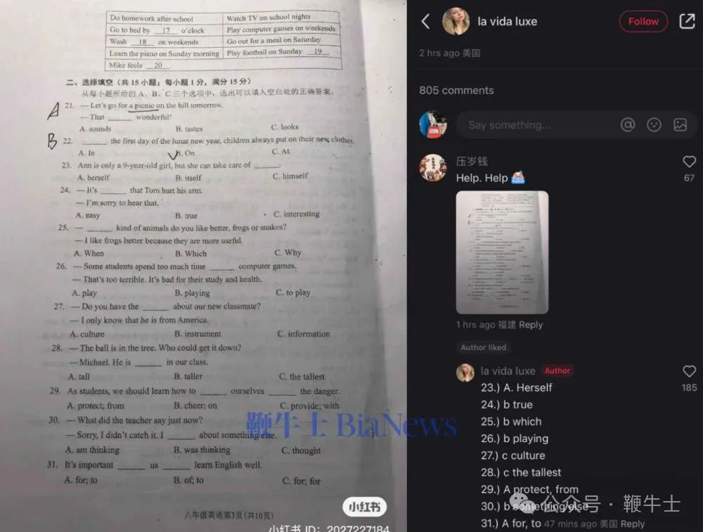 一位小红书用户甚至借此机会请一位美国TikTok用户帮助他完成英语作业。