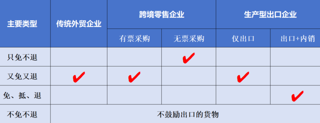 主要分为贸易型企业(包括传统外贸企业和跨境电商企业)和生产性外贸企业。生产性外贸企业又可细分为仅做出口或出口加内销两种。不同业务类型和经营情况,分别适用只免不退、又免又退和免抵退全适用等政策,当然也有不免不退的特殊情况。大家可对照图表,看看自己的企业适用哪种政策。