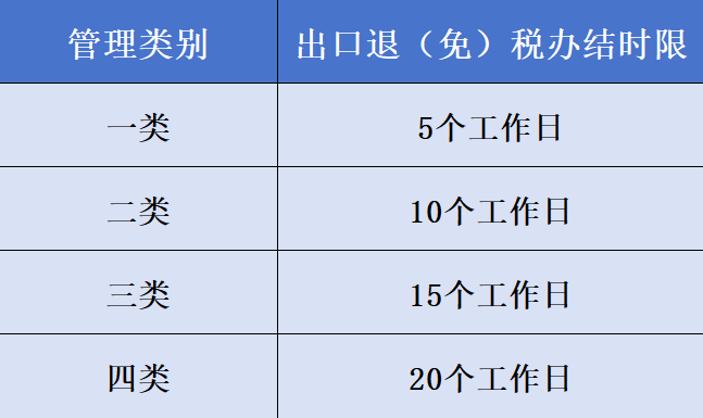 税务机关对出口企业实行分类管理,不同类型企业申请出口退免税办结时限不同。