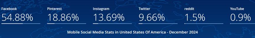 再看美国移动社交媒体的格局,Facebook更在走下坡路。2024年12月,Facebook在美国移动社交媒体的市场份额为54.88%,而2020年12月的市场份额还有61.09%。