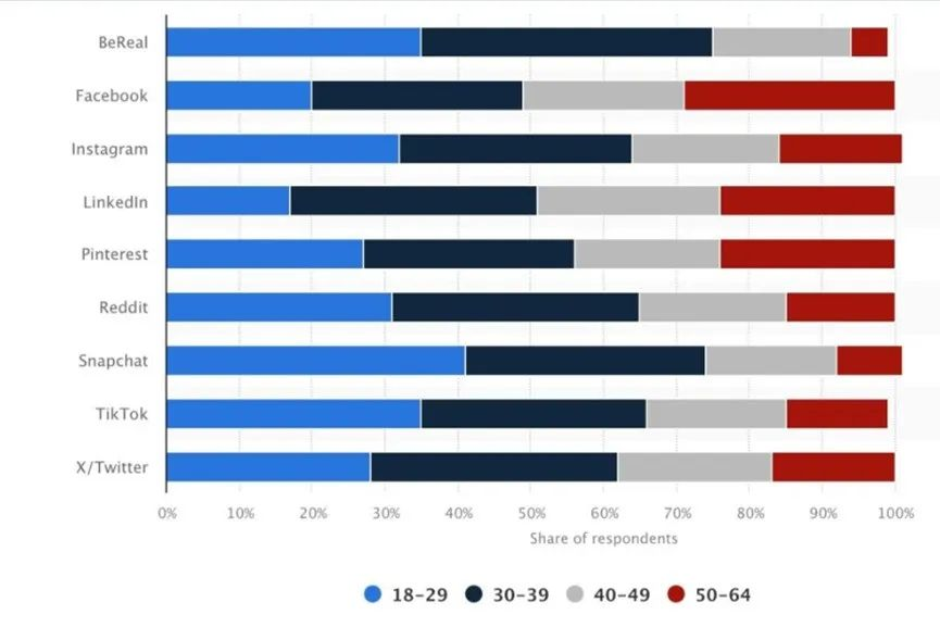 其二是Facebook明显出现用户老化的问题。根据statistia对2024年美国各大社交平台的用户年龄调查,Facebook最大的用户群是50-59 岁,占比29%,其次是40-49,占比22%。