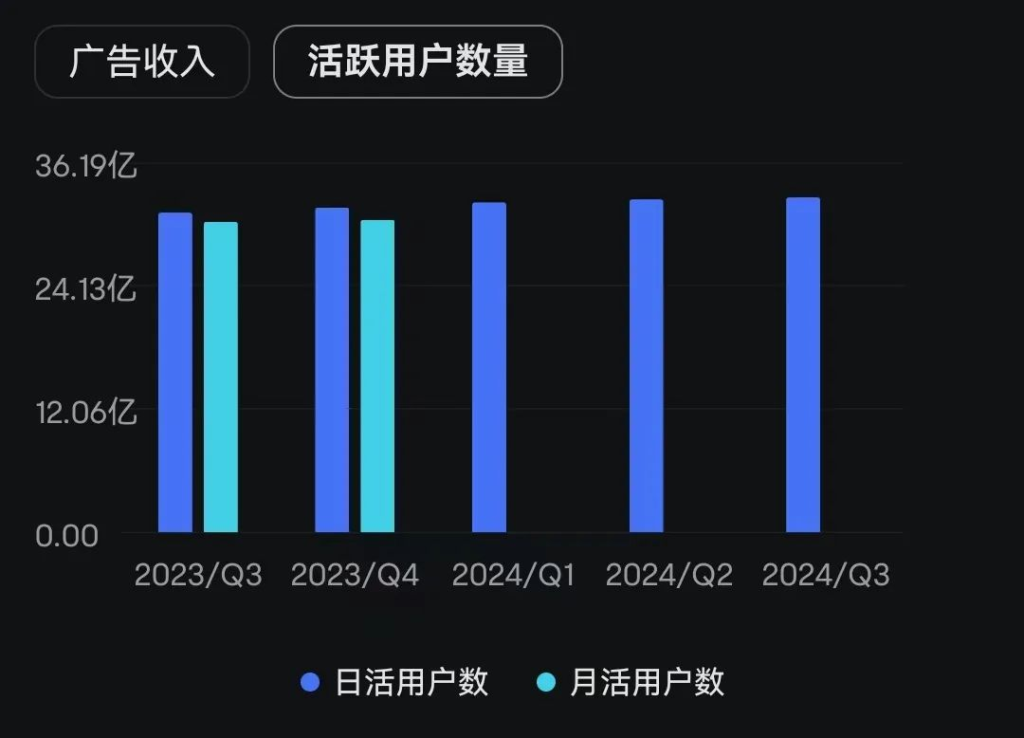 2024年Q3,Meta的应用家族(包括Facebook、Instagram、Messenger、WhatsApp)日活用户达到32.9亿,同比增长5%。考虑到全球只有80亿用户,这样的表现实在无可挑剔。