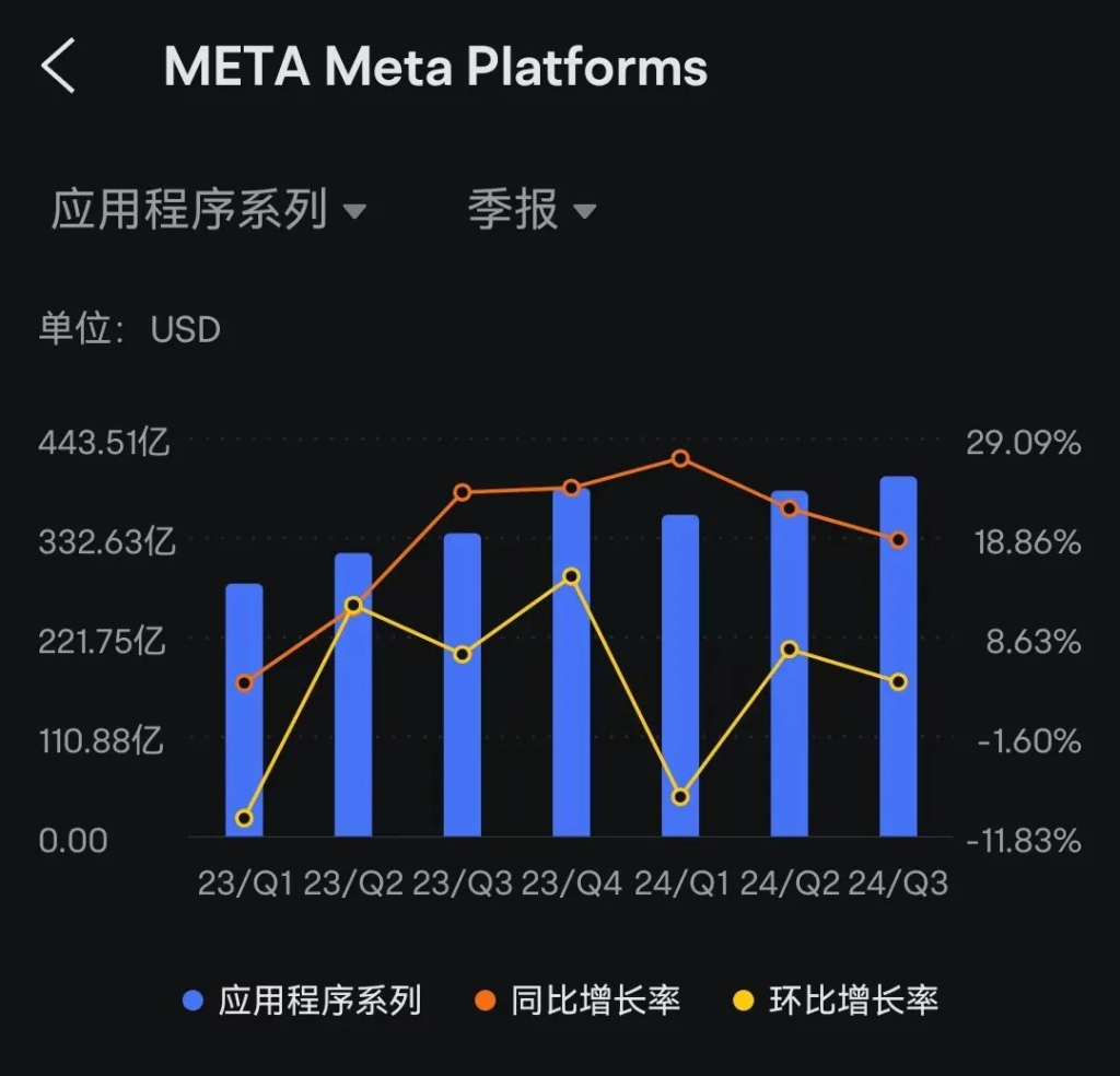 2023年,应用家族的广告营收达到1330亿美元,同比增长了16%。2024年前三个季度,广告业务分别同比增长了27%、22%和18.8%。