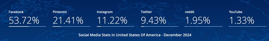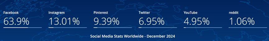 Facebook依然稳坐全球最大社交平台的宝座。根据statcounter的数据,2024年12月,Facebook在全球的市场份额为63.9%,遥遥领先于Instagram的13%、Pinterest的9.39%、X的6.95%、Youtube的4.95%。
