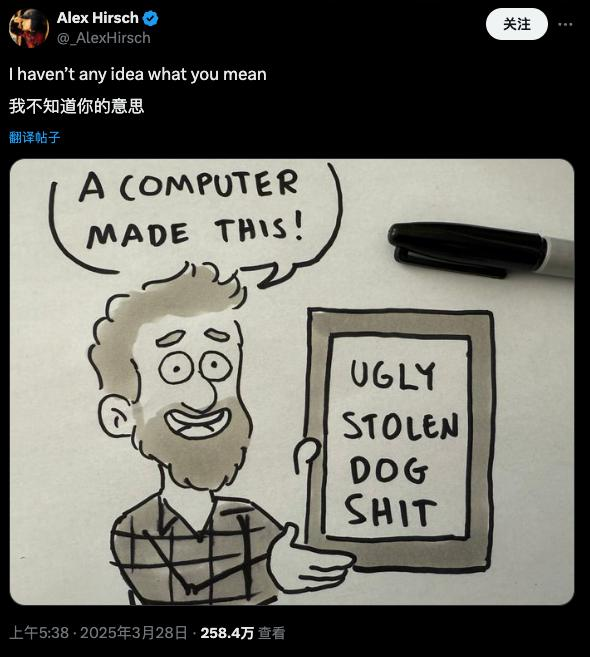 2010 年代迪士尼频道热播剧《怪诞小镇》的创作者亚历克斯·赫希 (Alex Hirsch)讽刺地回应奥特曼 :「哇,恭喜!使用吉卜力的作品来训练你的模型,并用吉卜力的名字来推广它,真的帮你赚了大钱!而且你打算向吉卜力支付一大笔版税,这也证明你是个好人!」