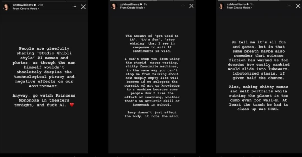 这些反对声中,Zelda Williams 的反应是最激烈的,她是已故喜剧演员 Robin Williams 的女儿,她连续发了几条 Instagram 笔记大力抨击。