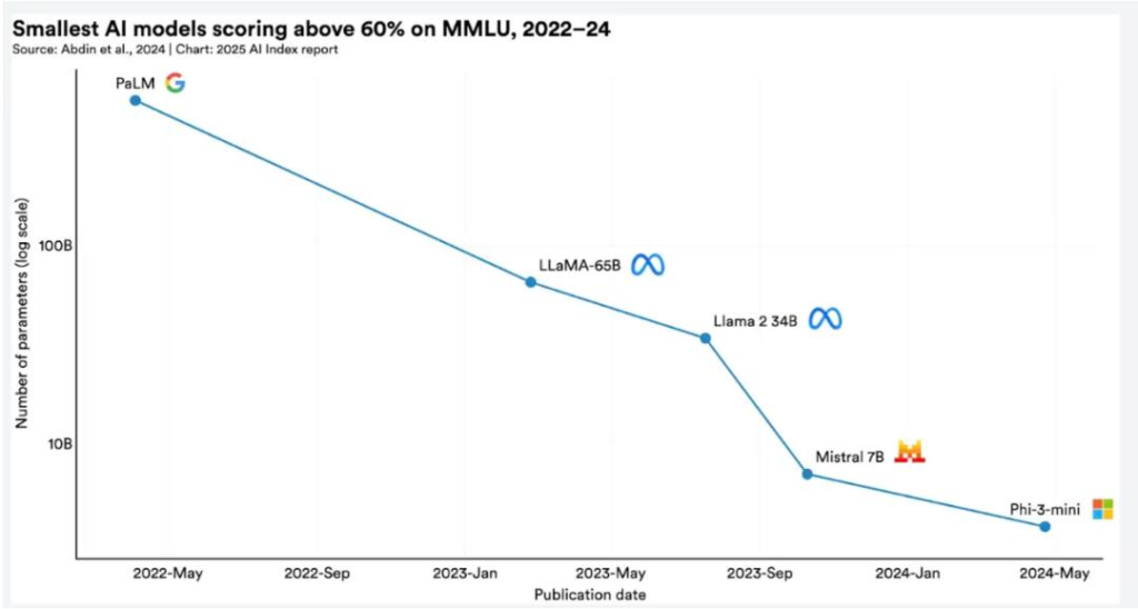 而到2024年,微软仅38亿参数的Phi-3-mini模型就实现了同等表现,两年间模型体积缩小了142倍。