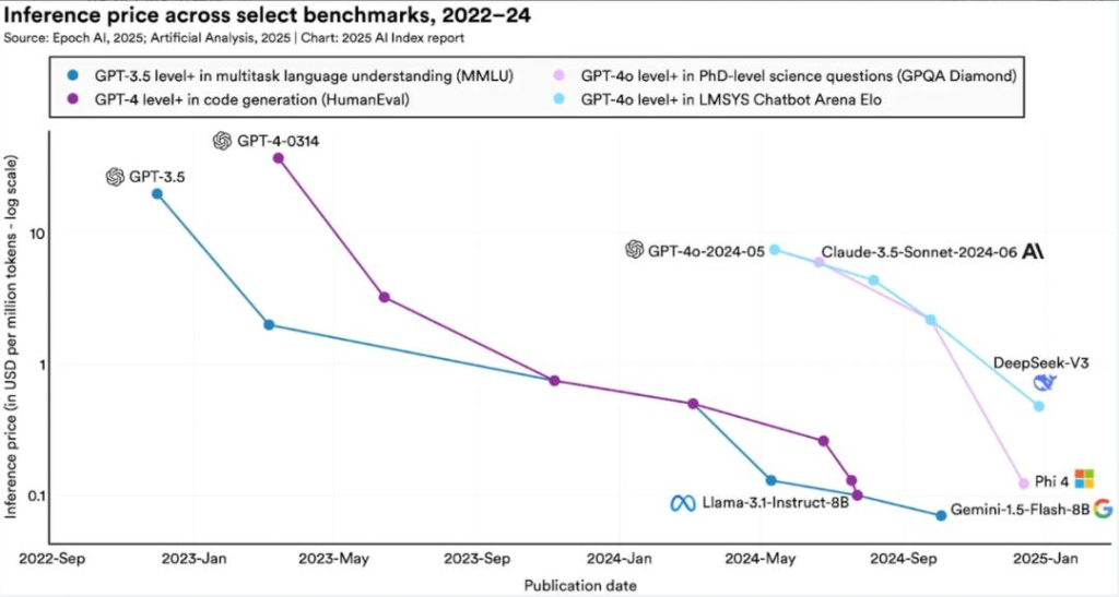 对于MMLU测试中达到GPT-3.5水平(64.8%准确率)的模型,单次百万token查询成本从2022年11月的20美元,暴跌至2024年10月的0.07美元(Gemini-1.5-Flash-8B模型),18个月内降幅超280倍。不同任务的LLM推理价格年降幅达9-900倍不等。