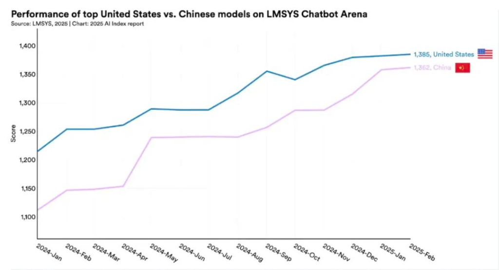 美国虽仍保持顶尖AI模型数量优势(2024年40个重要模型 vs 中国15个/欧洲3个),但中国模型在质量上快速逼近。