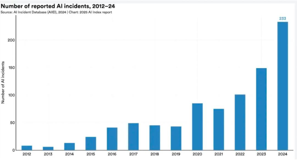 根据AI事件数据库(AI Incidents Database)统计,2024年AI相关危害事件达233起,创历史新高,较2023年暴增56.4%。典型案例包括深度伪造私密影像、涉嫌导致青少年自杀的聊天机器人等。虽非全貌,但问题激增态势令人震惊。